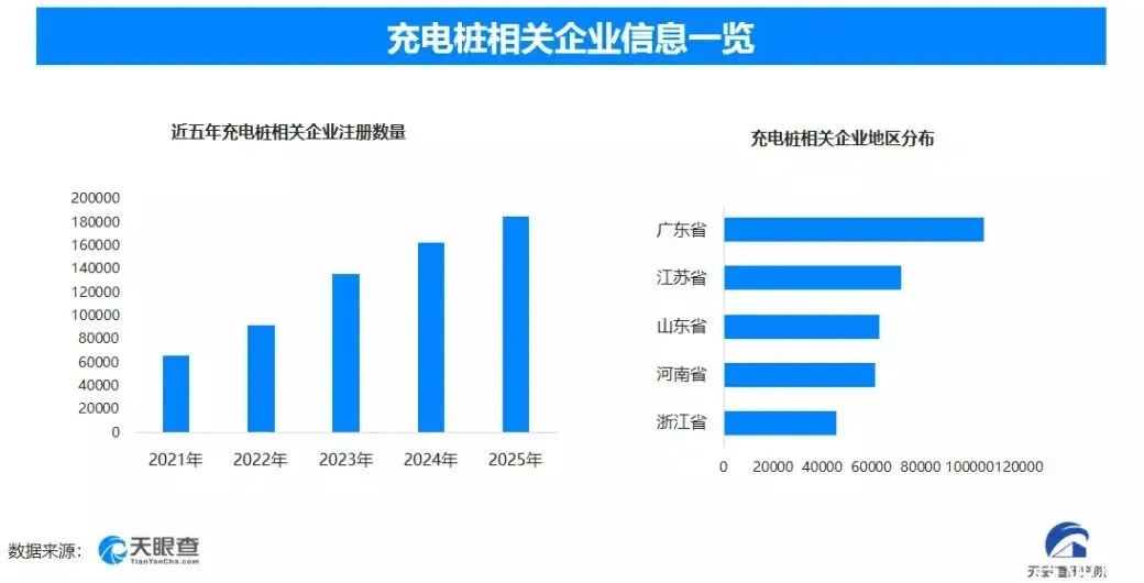天眼查专业版数据显示,截至目前我国现存在业、存续状态的充电桩相关企业超91.1万家。其中,2026年截至目前新增注册相关企业约3万余家,从企业注册数量趋势来看,近五年间,充电桩相关企业的注册数量呈现出逐年增长的态势,并在2025年达到顶峰。