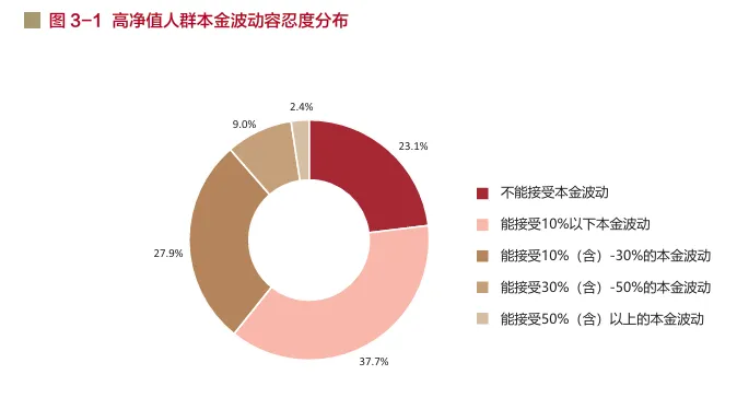 白皮书明确指出:“不能接受本金波动与能接受10%以下本金波动的高净值人群合计占比60.8%,能接受30%以上高波动的不足12%,50%以上波动的仅2.4%。” 这意味着,每10个高净值人群中,6人将本金安全放在首位,风险容忍度远低于预期。