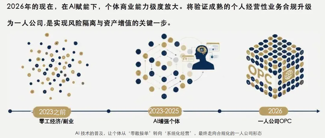 AI-OPC的崛起并非偶然,而是一人公司制度不断完善与人工智能产业持续升级双向驱动的结果。了解其发展历史脉络、政策环境演变及深层动因,能更清晰把握其发展规律,为后续优化发展路径、完善政策支持提供依据,具体分析如下: