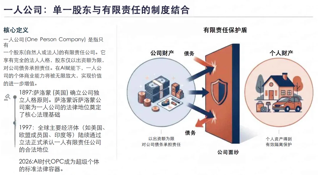人工智能一人公司(Artificial Intelligence One Person Company,简称AI-OPC),是数字经济与现代企业制度深度融合的新型市场主体,特指以单一自然人或法人为股东,以人工智能技术(含大模型、AI智能体、低代码工具等)为核心生产力,依托AI工具实现研发、生产、运营、服务全链路闭环运营,具备“碳基智慧+硅基执行”特征的一人有限责任公司或股份有限公司。作为人工智能技术普及与一人公司制度完善双重驱动下的产物,AI-OPC正在重塑创业生态与产业格局,成为推动人工智能“赋能千行百业”、激发市场创新活力、促进高质量发展的重要微观载体。