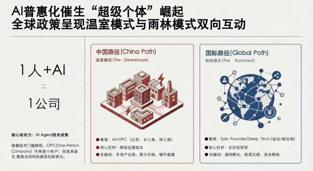 第三阶段:规模化规范发展期(2025年至今)—— 政策聚焦,生态完善。2025年以来,我国AI-OPC进入爆发式增长与规范化发展并行的阶段。一方面,AI技术持续迭代,AI智能体实现“任务拆解—工具调用—自主执行—结果校验”闭环,能够替代更多传统人力工作,推动AI-OPC的运营效率进一步提升;另一方面,各地政府纷纷出台专项政策,聚焦AI-OPC的培育与规范,如深圳印发《深圳市打造人工智能OPC创业生态引领地行动计划(2026—2027年)》,苏州举办首届人工智能OPC大会,系统提出AI-OPC创业新范式,杭州发布OPC-OS系统,完善AI-OPC服务配套。
