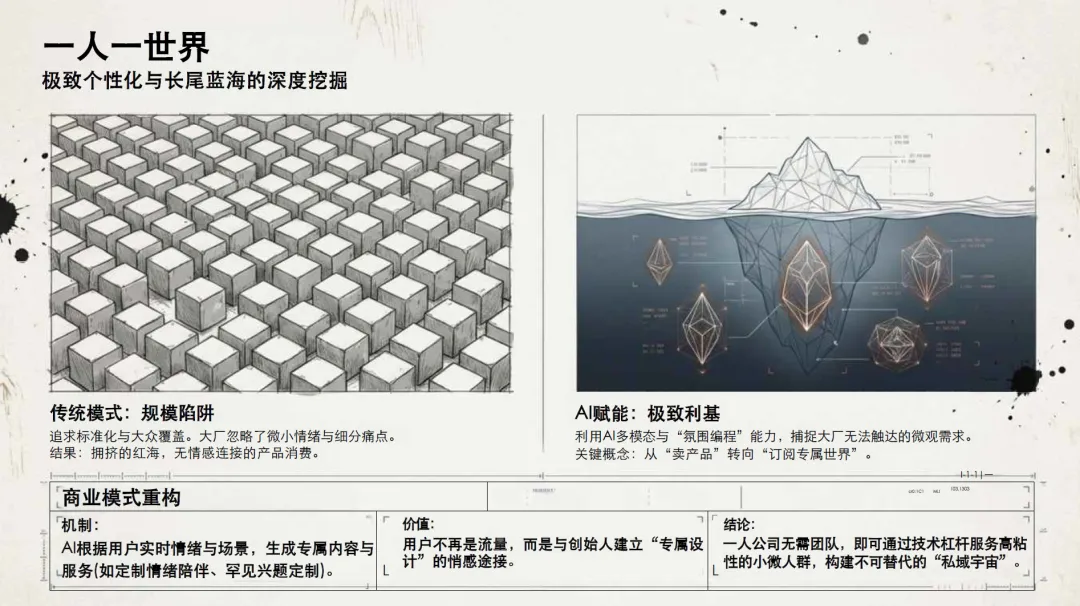 创新模式:AI-OPC 的创新集中在应用层,主打场景化 AI 应用创新与工具组合创新;普通一人公司以商业模式创新为核心方向;传统 AI 企业聚焦技术底层创新,重点突破核心算法与技术架构。