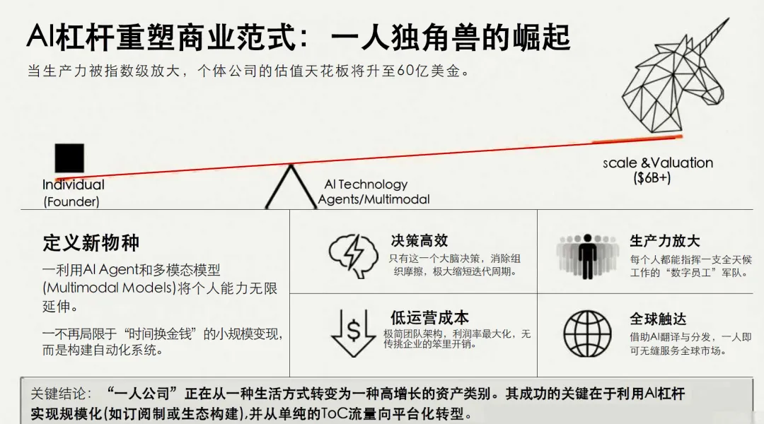 第二,技术核心性与AI基因原生性。以人工智能技术为核心生产力,核心业务离不开AI工具的支撑,如AI研发、AI内容生成、AI咨询、AI自动化服务等,天生具备AI基因,区别于普通一人公司“纯人工运营”的模式;创始人多具备AI应用能力或行业知识与AI技能的复合能力,核心竞争力在于将行业痛点转化为AI解决方案,而非单纯的资本投入或人力投入。