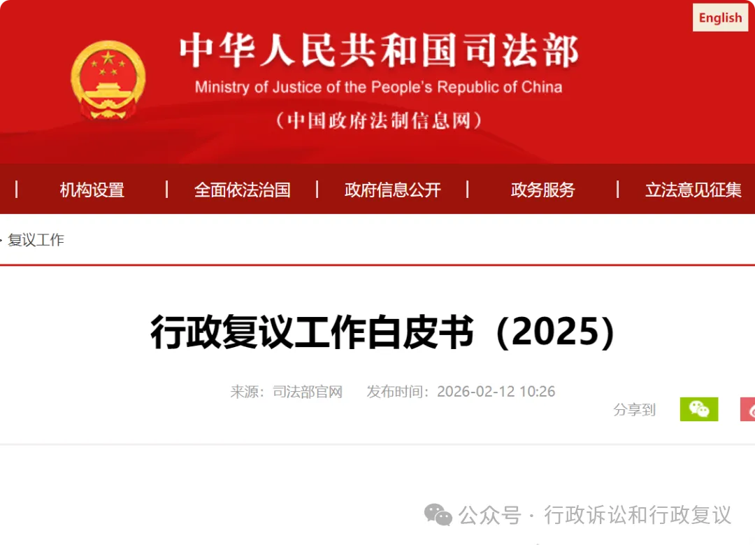 2026年2月12日,也就是今天,司法部官方网站发布《行政复议工作白皮书(2025)》。全国行政复议机关一年的办案量111.5万件。