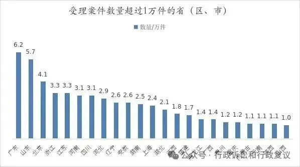 从层级分布上看,近九成(89.4%)的案件由市县两级人民政府立案受理。县级政府受理37.4万件,占57.7%;市级政府受理20.6万件,占31.7%;省级政府3.1万件,占4.8%;实行垂直领导的行政机关2.9万件,占4.5%。