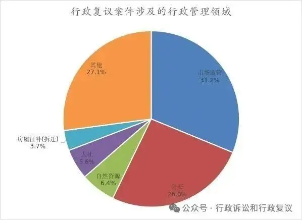 从行政管理领域上看,市场监管、公安仍是行政争议高发领域,在受理总量中的占比超过五成(57.2%),同比增长5.1个百分点。受理案件数量前5位是:市场监管20.2万件,占31.2%;公安16.8万件,占26.0%;自然资源4.1万件,占6.4%;人力资源和社会保障3.6万件,占5.6%;房屋征补(拆迁)2.4万件,占3.7%。