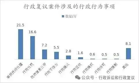 从行政行为事项上看,举报投诉处理、行政处罚、政府信息公开类案件数量较多,共占受理总量的69.8%。其中,举报投诉处理和行政处罚类案件数量同比分别上升33.0%和27.8%,政府信息公开案件数量则同比下降31.7%。前五位数量和占比分别是:举报投诉处理21.5万件,占33.1%;行政处罚16.6万件,占25.6%;政府信息公开7.2万件,占11.1%;行政不作为5.5万件,占8.5%;行政确认2.8万件,占4.3%。