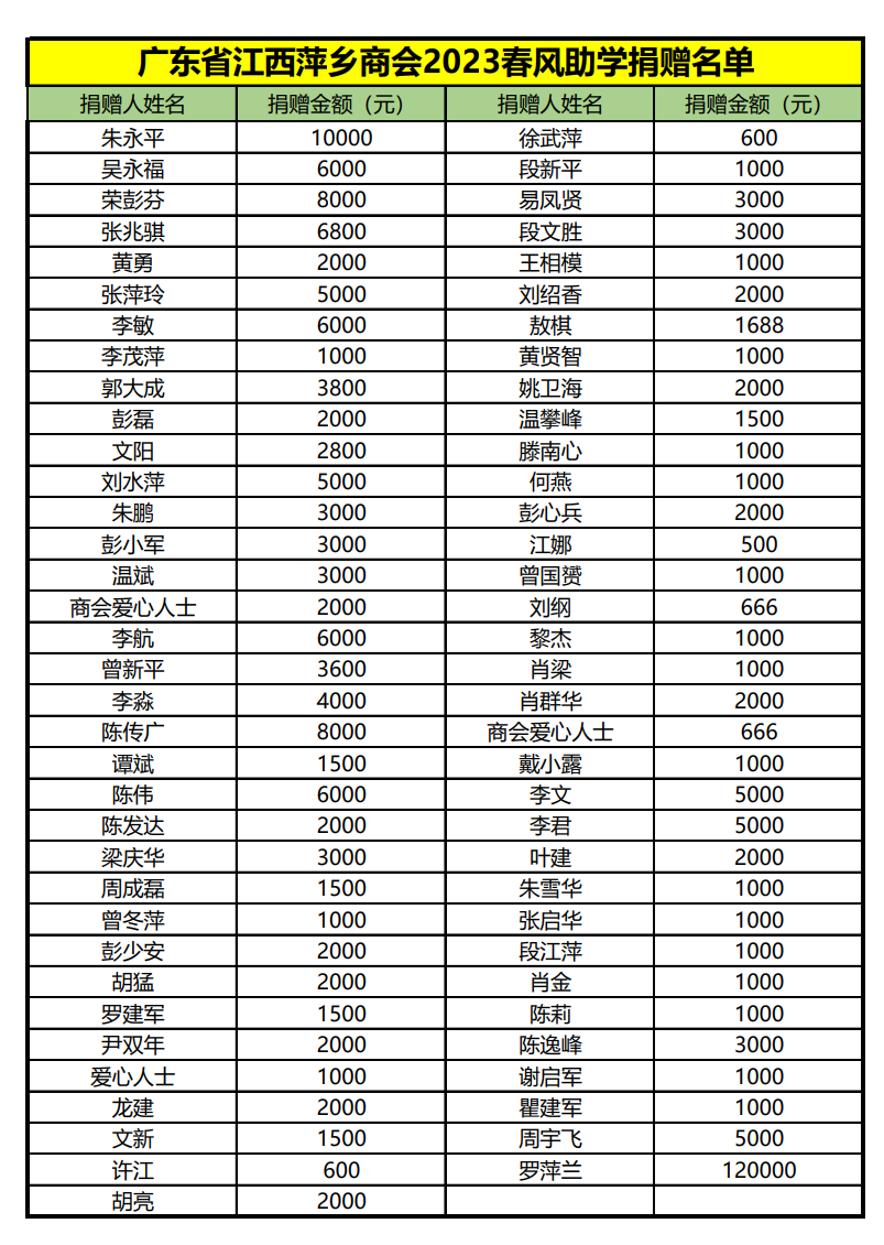 广东省江西萍乡商会成立于2013年,十年来传承着爱的奉献,全体在会萍乡籍企业家们,每年都慷慨解囊,向家乡人民奉献爱心。捐资助学是常态,抗灾救灾不缺席。十年来,春风助学活动捐款600多万元,受捐人数1906人,走访学生家庭3000余户。尊老爱老活动受赠老人800余人,捐赠物资、善款合计人民币四十余万元。今年的“春风助学”活动,共捐助了安源区、湘东区、上栗县、芦溪县、莲花县五地139名家庭困难的大学生、中学生和一部分小学生。