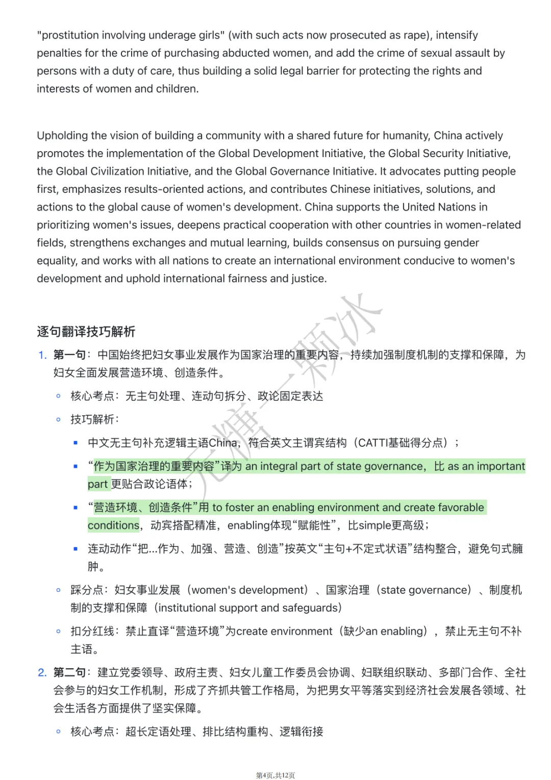 2.语料来源:全部选自《新时代中国推进妇女全面发展的实践与成就》白皮书官方中英双语文本,覆盖政策纲领、法治保障、民生发展、国际合作四大核心考点领域;