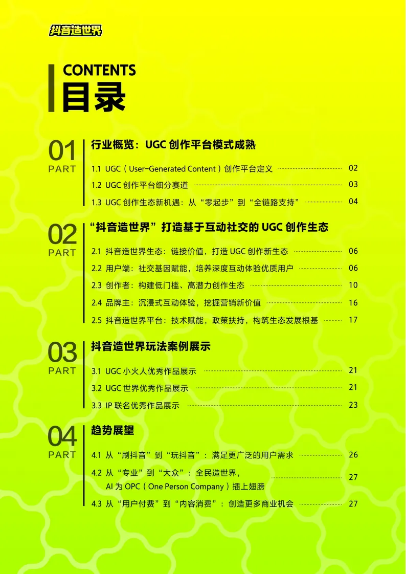 从“刷抖音”到“玩抖音”:平台边界将进一步拓宽,抖音将从内容消费场域进化为综合社交场域。用户将在虚拟世界中建立共同记忆,形成更强的群体归属感。全民造世界,OPC时代来临:随着AI技术的迭代,创作门槛将被彻底抹平。单个创业者凭借创意与AI工具,即可低成本快速试错,打造现象级产品。“一人公司”将成为主流创作形态。商业价值的重构:商业模式将从单一的“用户付费”转向“内容消费+品牌共建”。巨量引擎的成熟生态将为UGC创作者提供无缝对接的商业化底座,实现“流量-内容-商业-收益”的高效转化。结语
