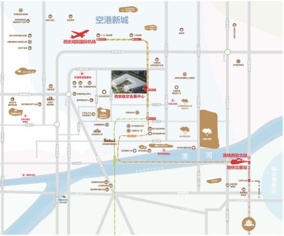 西安临空会展中心位于国家级临空经济示范区——空港新城,紧邻地铁14号线空港新城站,毗邻机场枢纽,与西安高铁北客站接轨,总建筑面积78000平方米,室内展览面积36000平方米,室外广场8000平方米。