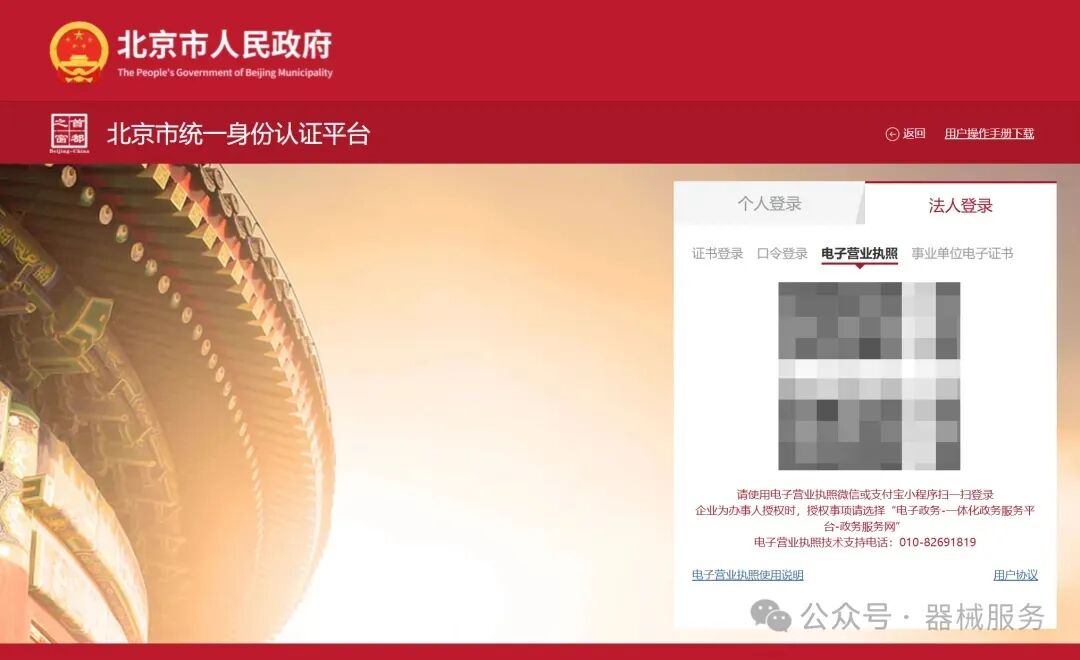 客户端使用WEB浏览器进行登陆,登录地址为https://zwfw.yjj.beijing.gov.cn/home。系统推荐使用谷歌Chrome浏览器、360浏览器或者Internet Explorer9(IE9)以上版本的浏览器进行登陆。通过北京市统一身份认证平台登录系统,支持证书登录、口令登录、电子营业执照登录及事业单位电子证书登录。