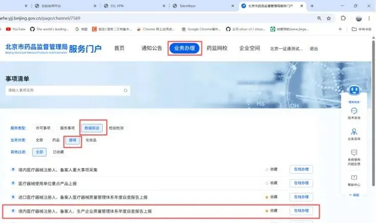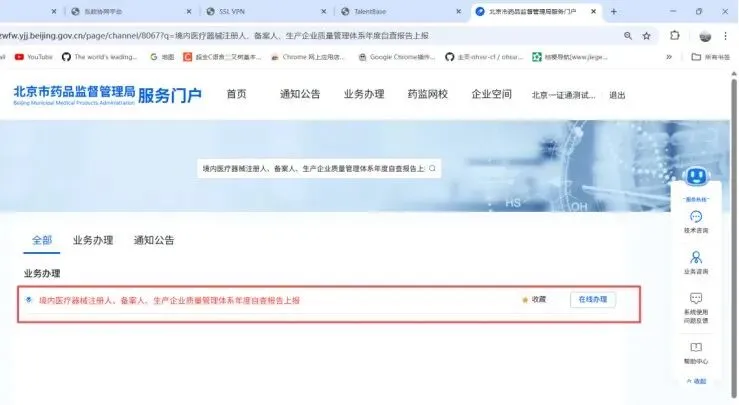 登录服务门户成功后可通过关键字检索“境内医疗器械注册人、备案人、生产企业质量管理体系年度自查报告上报”快捷找到办理入口,也可在以下位置找到办理入口。