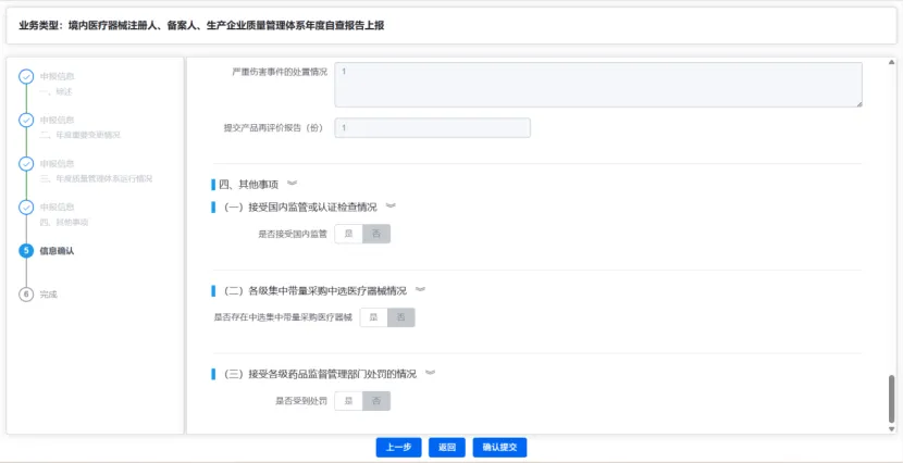 点击【下一步】进入【信息确认】页面,对填写的内容进行确认,无误后确认提交。有误可返回修改。