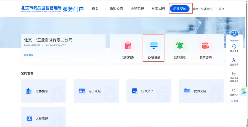 用户登录成功后可通过【企业空间】中的【办理记录】查看所有办理过的业务。