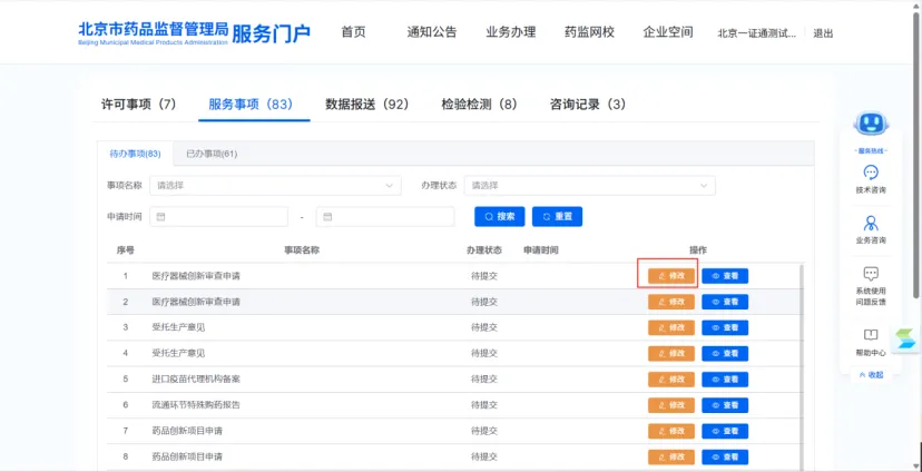 在填报过程中暂存的数据可通过【修改】继续填写。审核被退回的也可通过【修改】补充信息。已提交的业务可通过【撤销】取消提交。可通过相关搜索项快捷检索。