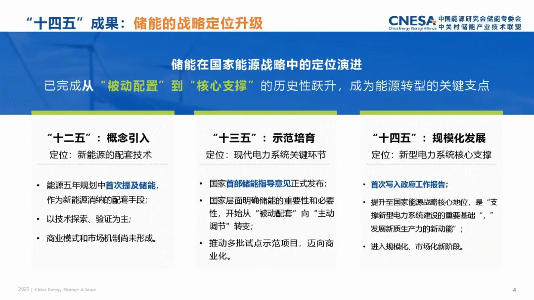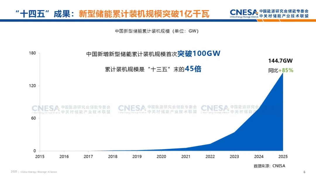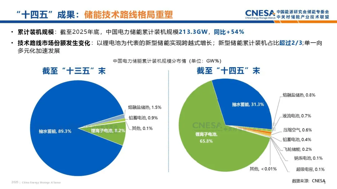 2025 储能政策全年盘点报告,梳理了我国储能产业在 “十四五” 期间的发展成果与 2025 年政策布局,明确了产业从政策驱动向市场驱动转型的核心趋势。“十四五” 期间,储能完成从新能源配套技术到新型电力系统核心支撑的战略定位跃升,截至 2025 年底,我国电力储能累计装机达 213.3GW,同比增长 54%,其中新型储能占比超 2/3,锂离子电池成为主流技术,累计装机规模达 144.7GW,是 “十三五” 末的 45 倍,新型储能实现跨越式发展。
