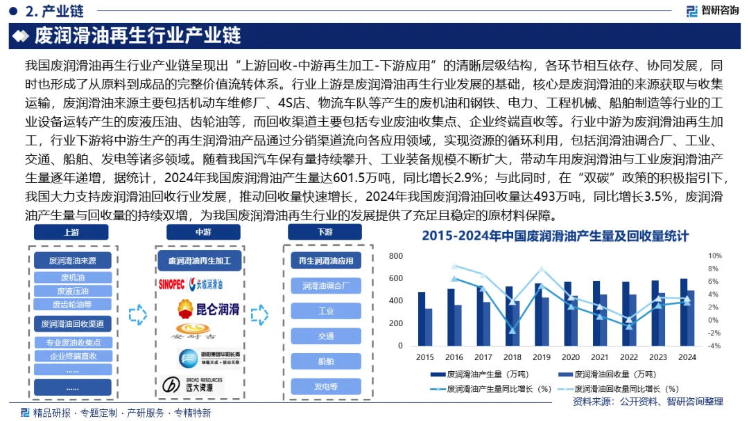 产业链核心节点:我国废润滑油再生行业产业链呈现出“上游回收-中游再生加工-下游应用”的清晰层级结构,各环节相互依存、协同发展,同时也形成了从原料到成品的完整价值流转体系。行业上游是废润滑油再生行业发展的基础,核心是废润滑油的来源获取与收集运输,废润滑油来源主要包括机动车维修厂、4S店、物流车队等产生的废机油和钢铁、电力、工程机械、船舶制造等行业的工业设备运转产生的废液压油、齿轮油等,而回收渠道主要包括专业废油收集点、企业终端直收等。行业中游为废润滑油再生加工,行业下游将中游生产的再生润滑油产品通过分销渠道流向各应用领域,实现资源的循环利用,包括润滑油调合厂、工业、交通、船舶、发电等诸多领域。