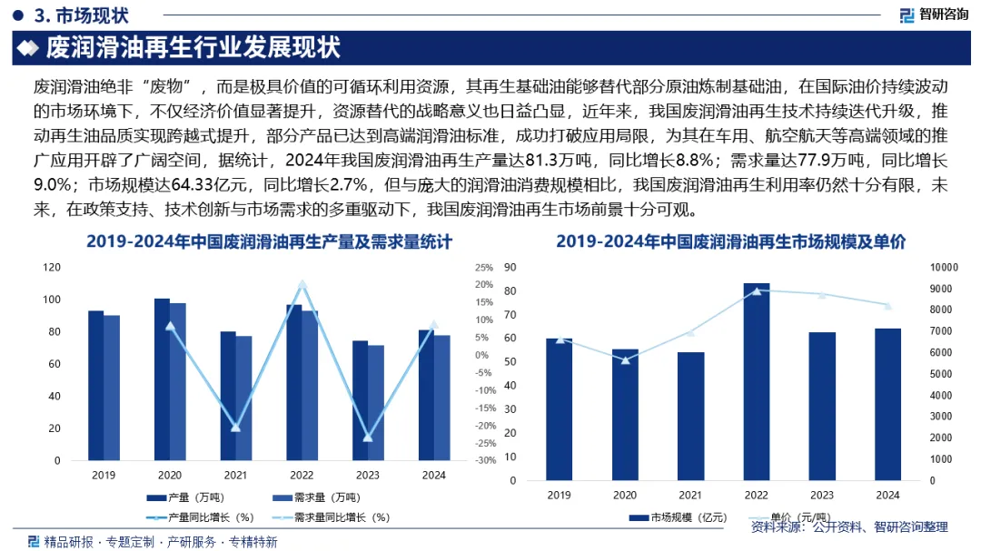 市场规模:废润滑油绝非“废物”,而是极具价值的可循环利用资源,其再生基础油能够替代部分原油炼制基础油,在国际油价持续波动的市场环境下,不仅经济价值显著提升,资源替代的战略意义也日益凸显,近年来,我国废润滑油再生技术持续迭代升级,推动再生油品质实现跨越式提升,部分产品已达到高端润滑油标准,成功打破应用局限,为其在车用、航空航天等高端领域的推广应用开辟了广阔空间,据统计,2024年我国废润滑油再生产量达81.3万吨,同比增长8.8%;需求量达77.9万吨,同比增长9.0%;市场规模达64.33亿元,同比增长2.7%。