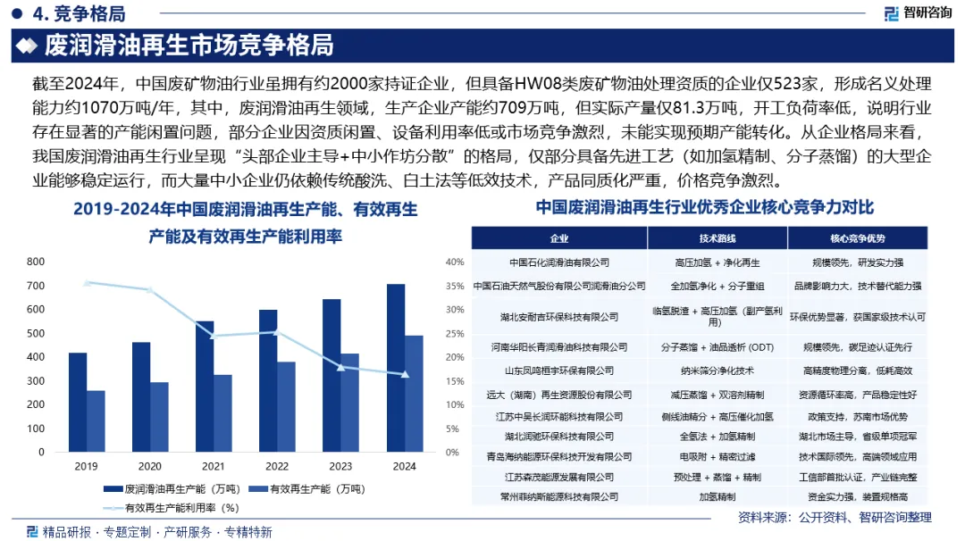 市场竞争格局:我国废润滑油再生行业呈现“头部企业主导+中小作坊分散”的格局,仅部分具备先进工艺(如加氢精制、分子蒸馏)的大型企业能够稳定运行,而大量中小企业仍依赖传统酸洗、白土法等低效技术,产品同质化严重,价格竞争激烈。