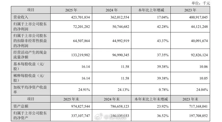 年报显示,公司全年营收4237.02亿元,同比增长17.04%,扭转2024年下滑态势;归母净利润722.01亿元,同比大增42.28%,日均盈利接近2亿元,盈利质量与增速双双领跑行业。经营现金流净额达1332亿元,同比增长超三成,货币资金及交易性金融资产合计近4000亿元,财务状况十分稳健。