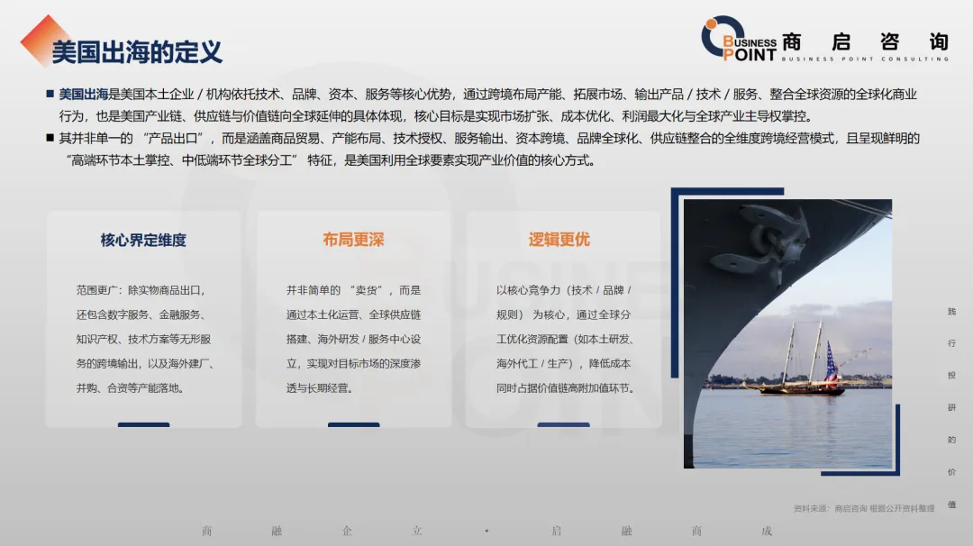 美国出海是美国本土企业 / 机构依托技术、品牌、资本、服务等核心优势,通过跨境布局产能、拓展市场、输出产品 / 技术 / 服务、整合全球资源的全球化商业行为,也是美国产业链、供应链与价值链向全球延伸的具体体现,核心目标是实现市场扩张、成本优化、利润最大化与全球产业主导权掌控。