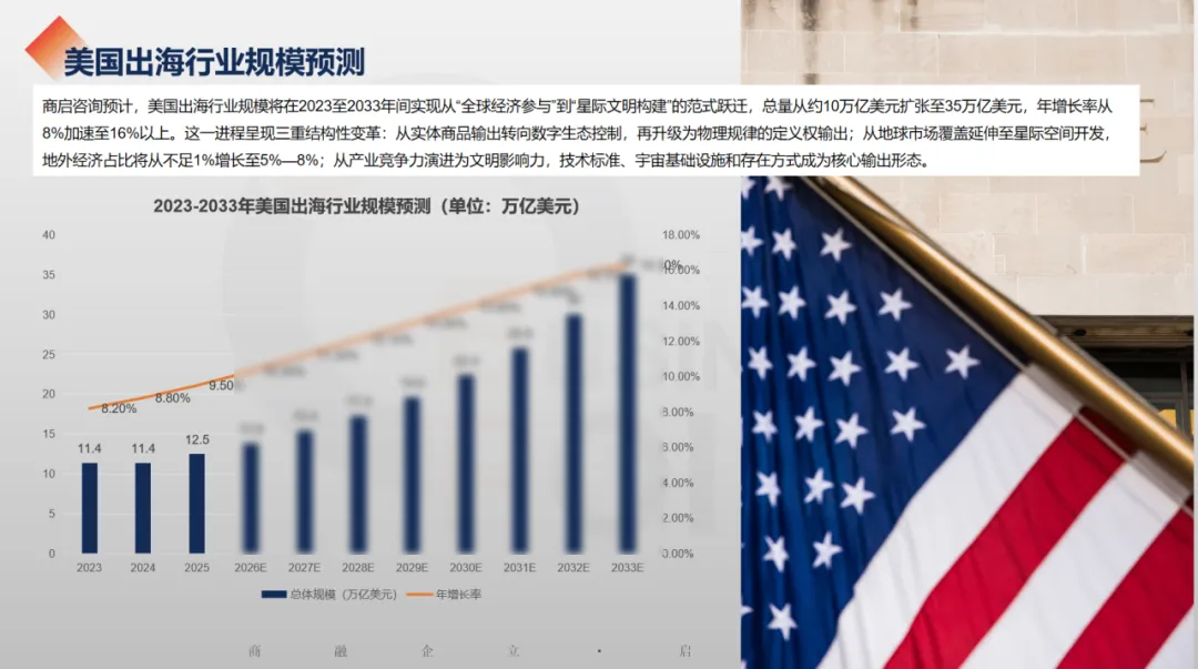 商启咨询预计,美国出海行业规模将在2023至2033年间实现从“全球经济参与”到“星际文明构建”的范式跃迁,总量从约10万亿美元扩张至35万亿美元,年增长率从8%加速至16%以上。这一进程呈现三重结构性变革:从实体商品输出转向数字生态控制,再升级为物理规律的定义权输出;从地球市场覆盖延伸至星际空间开发,地外经济占比将从不足1%增长至5%—8%;从产业竞争力演进为文明影响力,技术标准、宇宙基础设施和存在方式成为核心输出形态。