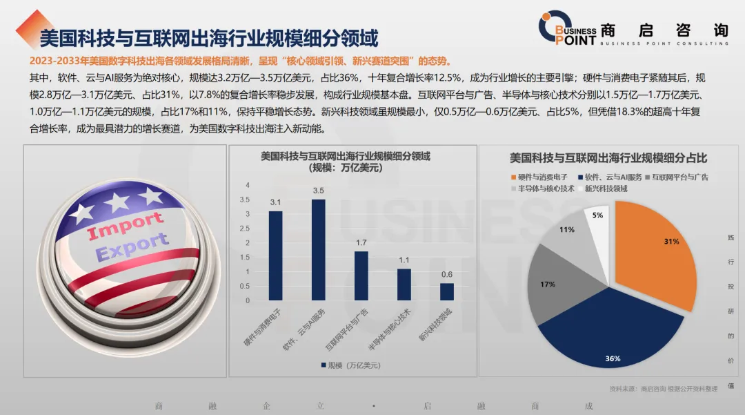 其中,软件、云与AI服务为绝对核心,规模达3.2万亿—3.5万亿美元,占比36%,十年复合增长率12.5%,成为行业增长的主要引擎;硬件与消费电子紧随其后,规模2.8万亿—3.1万亿美元、占比31%,以7.8%的复合增长率稳步发展,构成行业规模基本盘。互联网平台与广告、半导体与核心技术分别以1.5万亿—1.7万亿美元、1.0万亿—1.1万亿美元的规模,占比17%和11%,保持平稳增长态势。新兴科技领域虽规模最小,仅0.5万亿—0.6万亿美元、占比5%,但凭借18.3%的超高十年复合增长率,成为最具潜力的增长赛道,为美国数字科技出海注入新动能。
