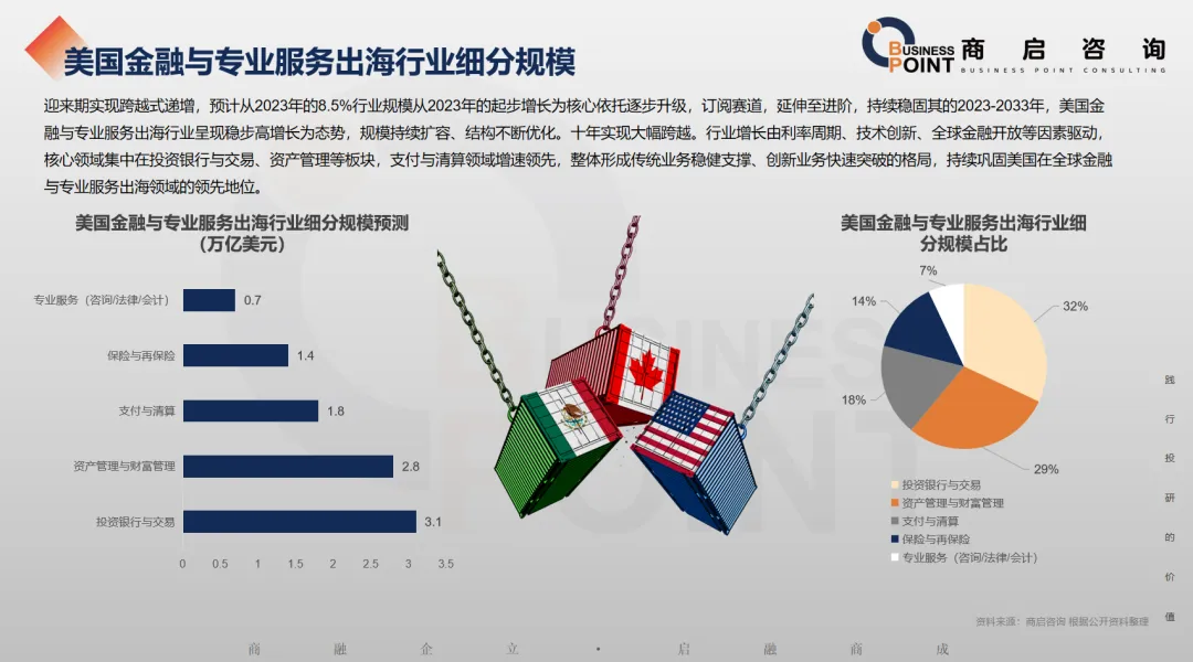 迎来期实现跨越式递增,预计从2023年的8.5%行业规模从2023年的起步增长为核心依托逐步升级,订阅赛道,延伸至进阶,持续稳固其的2023-2033年,美国金融与专业服务出海行业呈现稳步高增长为态势,规模持续扩容、结构不断优化。十年实现大幅跨越。行业增长由利率周期、技术创新、全球金融开放等因素驱动,核心领域集中在投资银行与交易、资产管理等板块,支付与清算领域增速领先,整体形成传统业务稳健支撑、创新业务快速突破的格局,持续巩固美国在全球金融与专业服务出海领域的领先地位。
