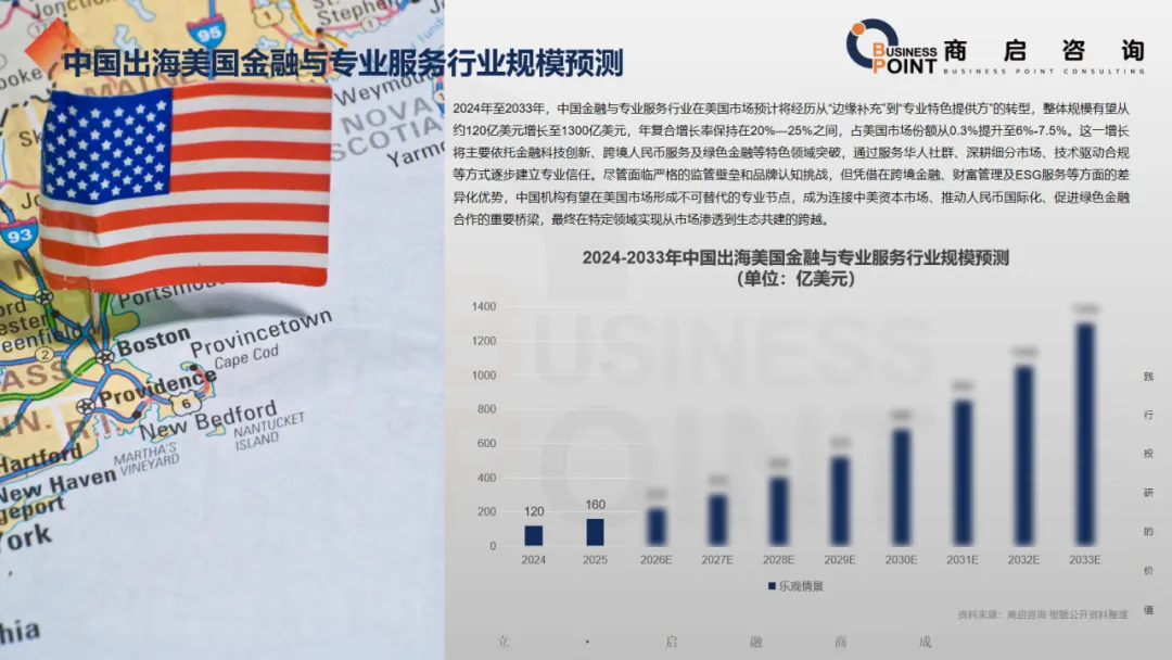 2024年至2033年,中国金融与专业服务行业在美国市场预计将经历从“边缘补充”到“专业特色提供方”的转型,整体规模有望从约120亿美元增长至1300亿美元,年复合增长率保持在20%—25%之间,占美国市场份额从0.3%提升至6%-7.5%。这一增长将主要依托金融科技创新、跨境人民币服务及绿色金融等特色领域突破,通过服务华人社群、深耕细分市场、技术驱动合规等方式逐步建立专业信任。尽管面临严格的监管壁垒和品牌认知挑战,但凭借在跨境金融、财富管理及ESG服务等方面的差异化优势,中国机构有望在美国市场形成不可替代的专业节点,成为连接中美资本市场、推动人民币国际化、促进绿色金融合作的重要桥梁,最终在特定领域实现从市场渗透到生态共建的跨越。