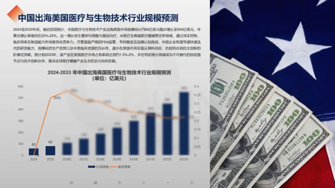 2024至2033年间,商启咨询预计,中国医疗与生物技术产业出海美国市场规模将从约60亿美元稳步增长至550亿美元,年复合增长率维持在20%-25%。这一增长将主要依托细胞与基因治疗、AI医疗及高端医疗器械等优势领域,通过成本控制、临床效率及制造能力形成差异化竞争力。尽管面临严格的FDA监管、专利壁垒及品牌认知挑战,中国企业有望凭借快速迭代的研发能力、规模化的生产优势以及中美临床资源的互补性,逐步在美国市场实现从原料供应、仿创结合到自主创新的阶梯式突破。预计到2033年,该产业在美国医疗市场占有率将达到约1.5%-2%,并在特定细分领域成为不可替代的供应链节点与技术创新伙伴,推动全球医疗健康产业生态的多元协同发展。