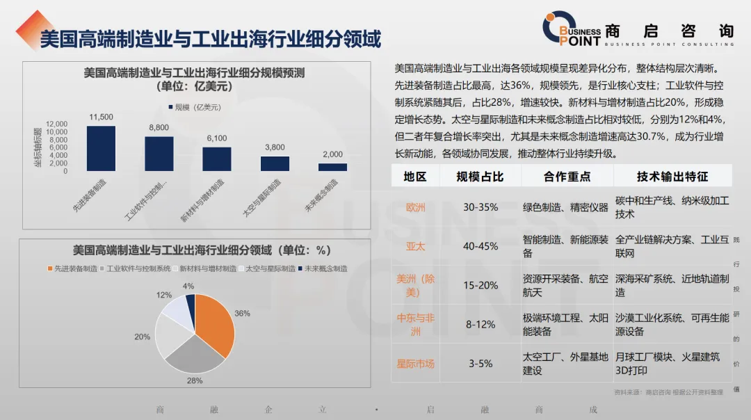 美国高端制造业与工业出海各领域规模呈现差异化分布,整体结构层次清晰。先进装备制造占比最高,达36%,规模领先,是行业核心支柱;工业软件与控制系统紧随其后,占比28%,增速较快。新材料与增材制造占比20%,形成稳定增长态势。太空与星际制造和未来概念制造占比相对较低,分别为12%和4%,但二者年复合增长率突出,尤其是未来概念制造增速高达30.7%,成为行业增长新动能,各领域协同发展,推动整体行业持续升级。