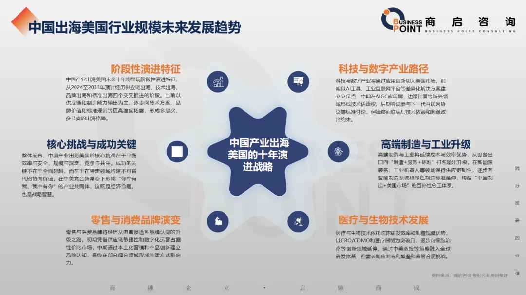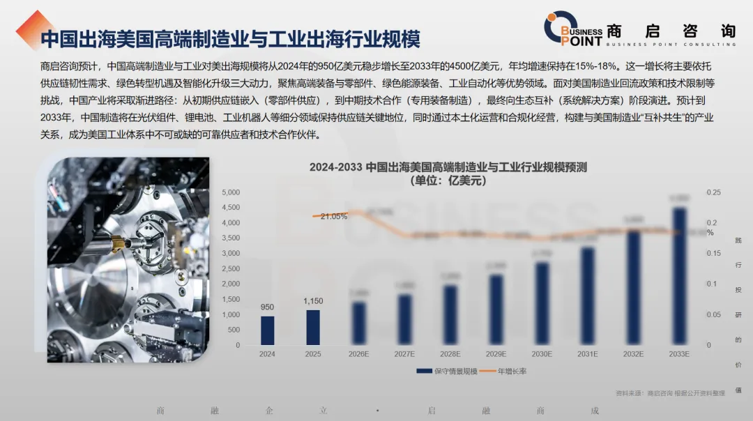 商启咨询预计,中国高端制造业与工业对美出海规模将从2024年的950亿美元稳步增长至2033年的4500亿美元,年均增速保持在15%-18%。这一增长将主要依托供应链韧性需求、绿色转型机遇及智能化升级三大动力,聚焦高端装备与零部件、绿色能源装备、工业自动化等优势领域。面对美国制造业回流政策和技术限制等挑战,中国产业将采取渐进路径:从初期供应链嵌入(零部件供应),到中期技术合作(专用装备制造),最终向生态互补(系统解决方案)阶段演进。预计到2033年,中国制造将在光伏组件、锂电池、工业机器人等细分领域保持供应链关键地位,同时通过本土化运营和合规化经营,构建与美国制造业“互补共生”的产业关系,成为美国工业体系中不可或缺的可靠供应者和技术合作伙伴。