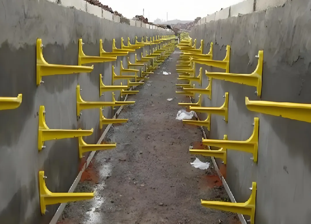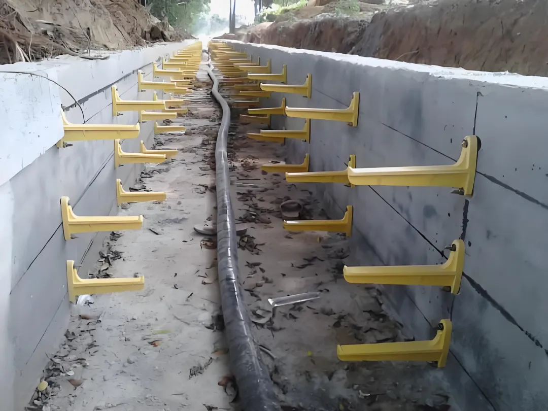 安装需严格遵循受力均衡、安全稳固原则,把控关键细节:前期按电缆规格、敷设数量选型,同侧支架水平间距控制在80cm,双侧支架建议错开安装,保持水平安装,严禁托臂下倾,高低偏差不大于5mm。固定环节,混凝土基体采用膨胀螺栓锚固,埋深不小于70mm,单支架固定点不少于4颗,确保紧固无松动;预埋式支架需与混凝土充分咬合,杜绝扭曲受力。施工严禁在托臂上站人、超载施压,电缆轻放轻拖,避免划伤支架;敷设后挠度不大于跨度1/200,大跨度场景不大于1/150,恶劣环境无需额外防腐,定期核查螺栓状态即可。