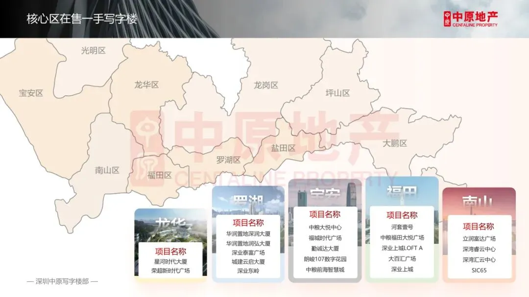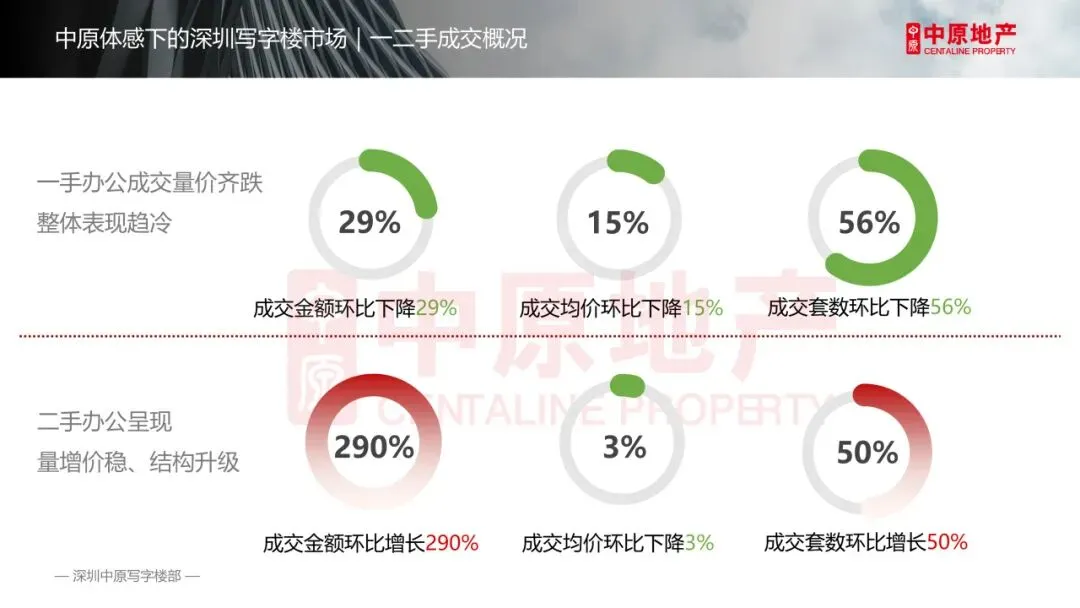 3.福田CBD二手写字楼成交活跃,多个标杆项目录得多笔数千平米成交;一手市场南山、罗湖占比领先,分别达30%、16%,核心区优质项目因售价探底受优质企业青睐。