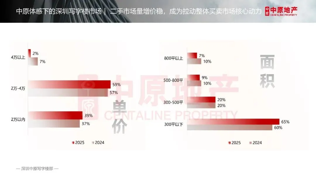3.2025年深圳写字楼买卖市场呈现“一手冷、二手热”的分化格局,一手市场量价齐跌,二手市场量增价稳。