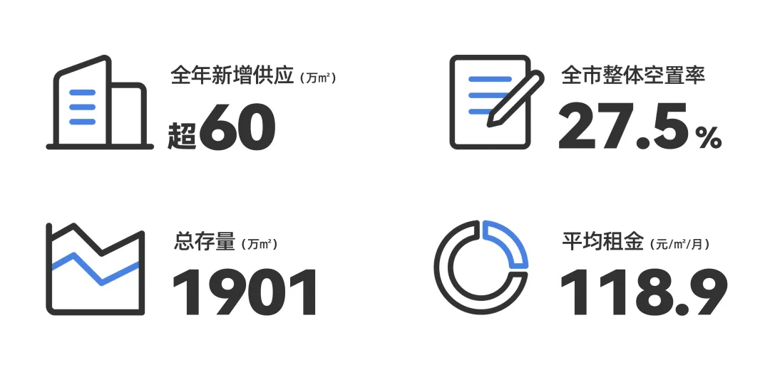 2025年写字楼租赁市场,成交量和成交均价延续下行趋势,全年吸纳量42.2万平,平均租金118.9元/㎡,全市平均租金同比降幅约10%,全市整体空置率约27.5%,全年新增供应超60万平,供应高峰持续,业主方面普遍采取 “以价换量” 策略,导致租金持续承压。