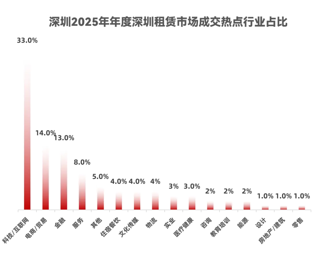 2025年深圳写字楼租赁市场成交行业,科技/互联网行业以33%位居市场第一梯队,电商/贸易、金融行业分别占14%与13%;租赁面积在300㎡以下的典型行业为贸易/电商、专业服务、设计、咨询等行业; 其次1000㎡以上租赁需求主要集中科技、医疗、物流、餐饮酒店等领域。科技 / 互联网行业唯一覆盖全面积段且各段占比相对均衡。