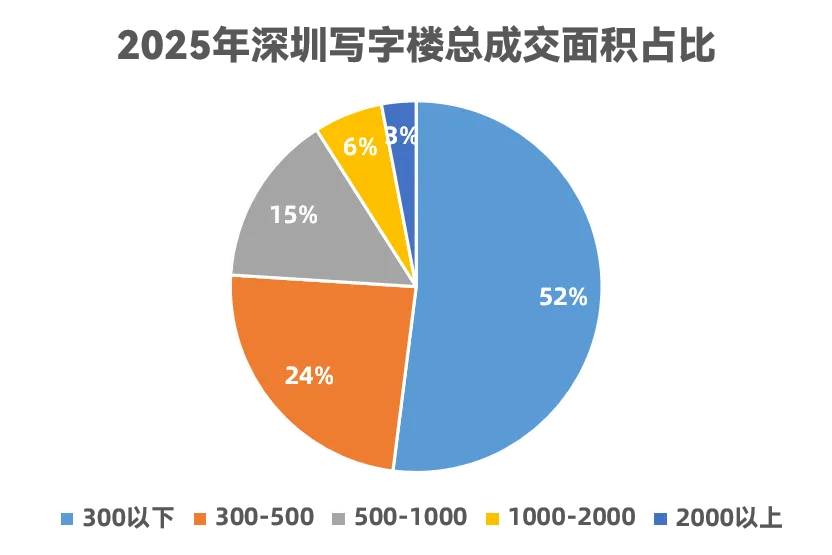 2025年深圳写字楼租赁市场成交面积以300平以下小面积为主,占比过半。南山区作为金融、科技核心区,500平以上中大户型显著高于其他区,是中大型企业总部聚集地。福田区作为金融、服务业核心区,各面积段分布相较其他区域更为平衡;宝安区与龙华区依旧以小面积需求为主,性价比较高承接了周边大量制造、科技等企业改善办公环境的需求,伴随产业升级,中户型(300-500㎡)需求较往年提升。