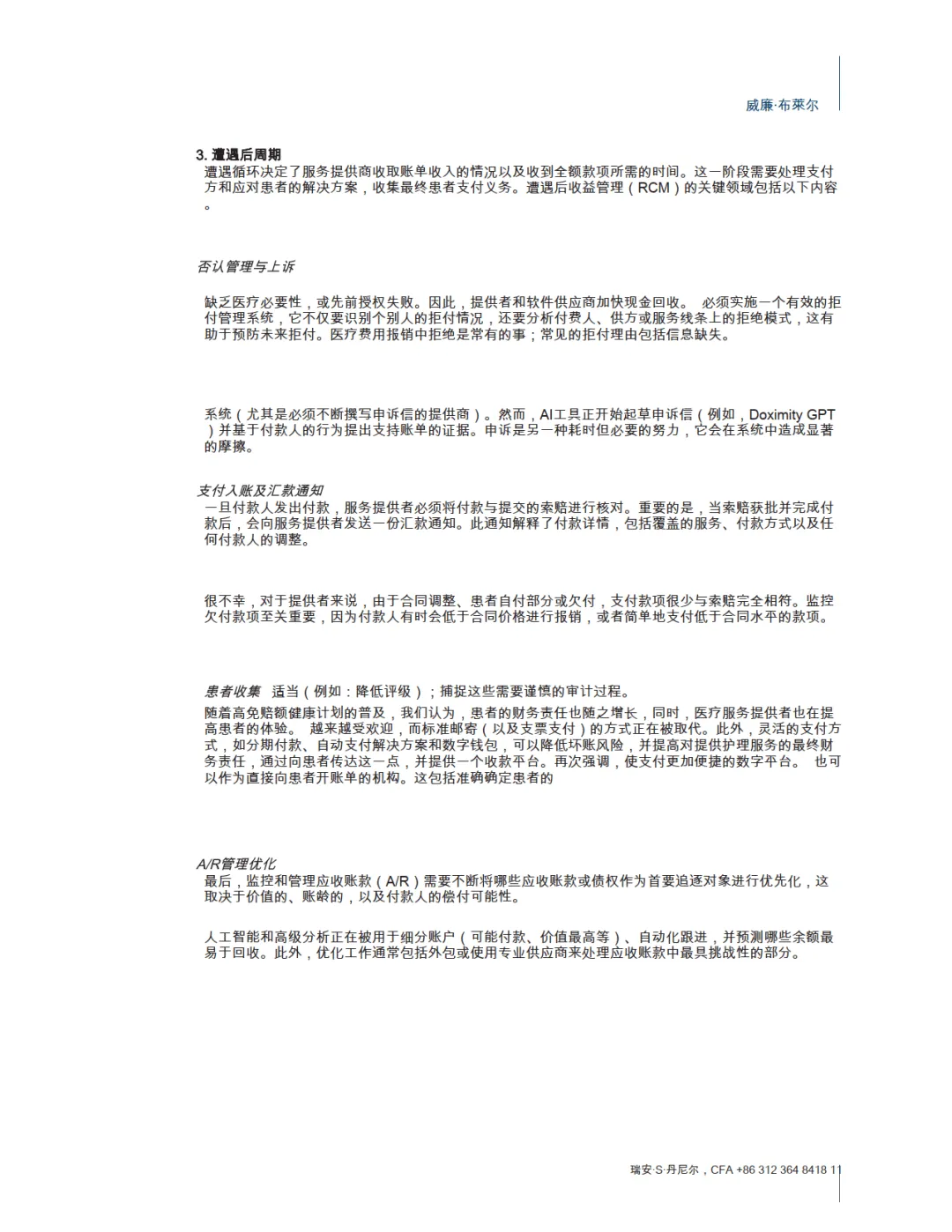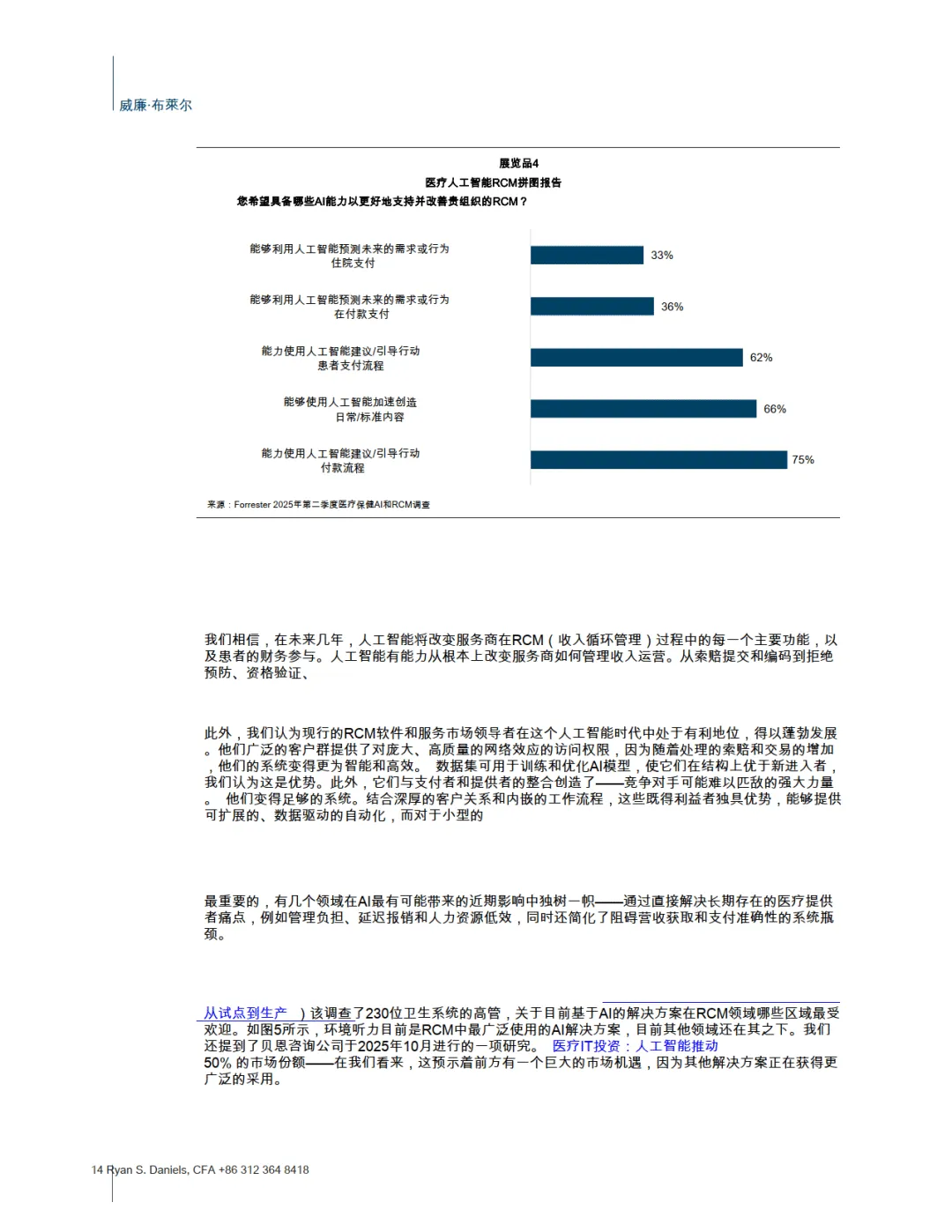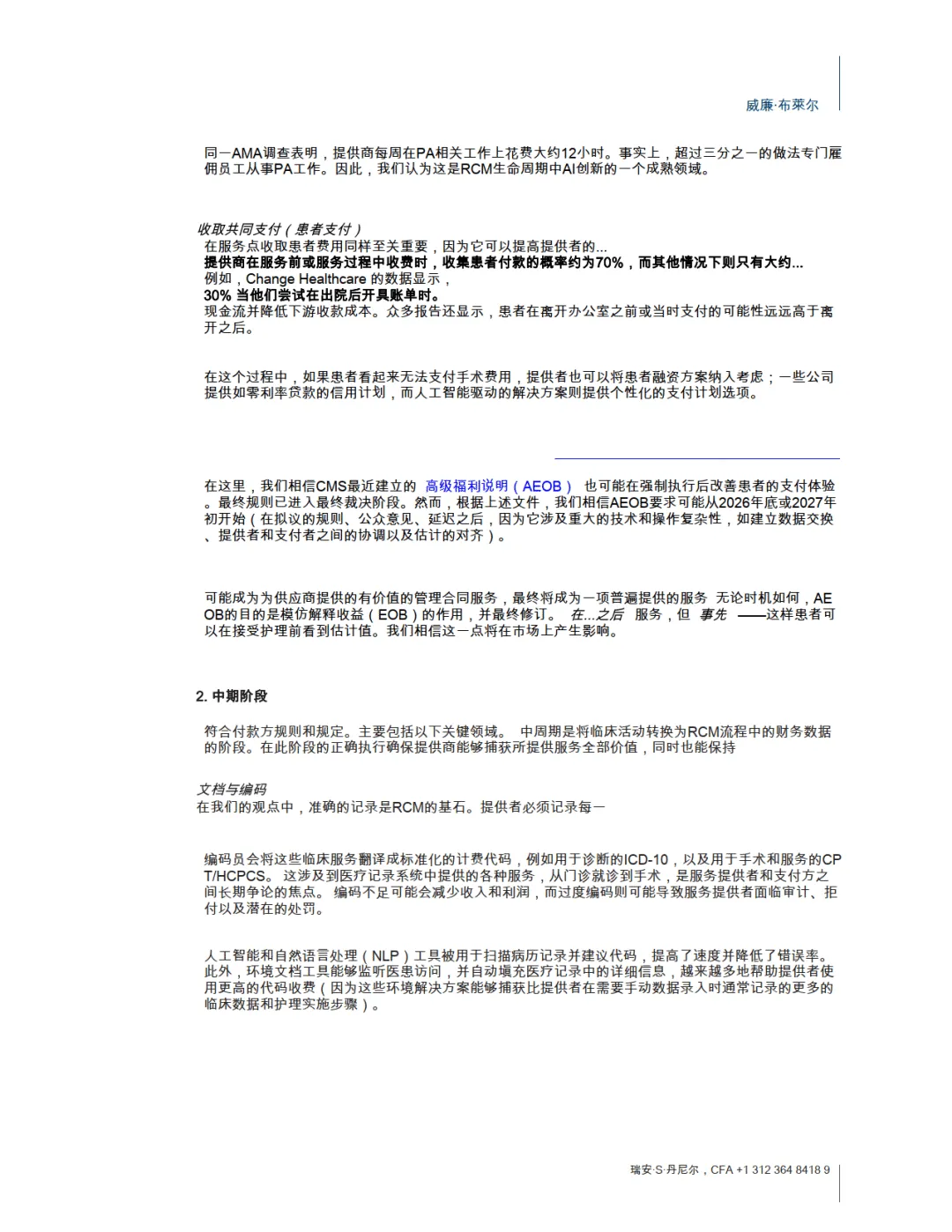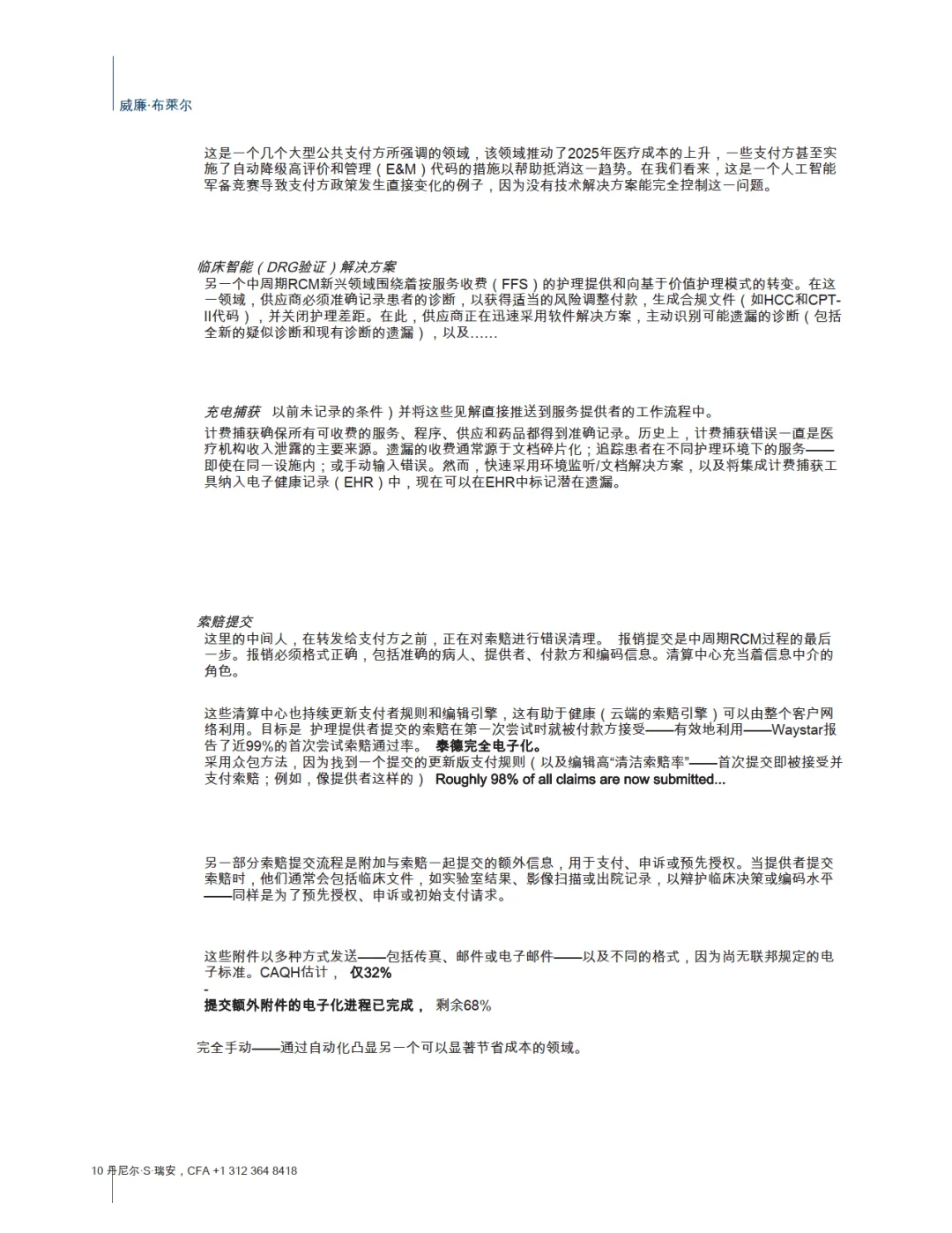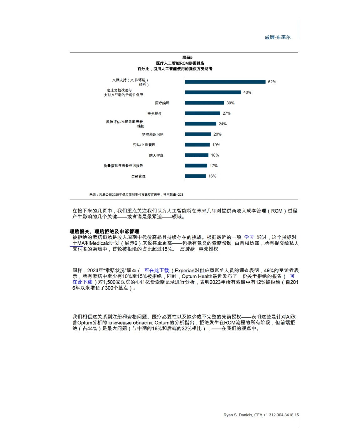 报告将 RCM 流程分为术前、术中、术后三个阶段,AI 在各阶段均实现深度应用:术前通过 AI 聊天机器人、保险资格自动验证、价格精准估算等优化患者体验并减少前期错误;术中依托自然语言处理实现临床文档自动编码、计费捕获优化,提升索赔提交的准确性;术后利用 AI 完成拒赔预测与上诉自动化、汇款流程整合、应收账款智能管理,大幅降低拒付率并加速资金回笼。其中,索赔拒付管理、预先授权自动化、患者财务互动数字化是 AI 应用的核心痛点领域,相关解决方案已实现拒付率显著下降、医护人员行政工作时间大幅减少的实际效果。