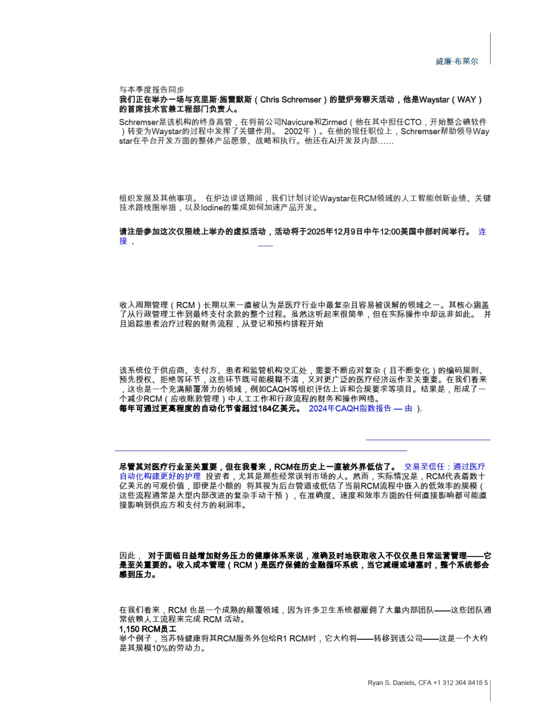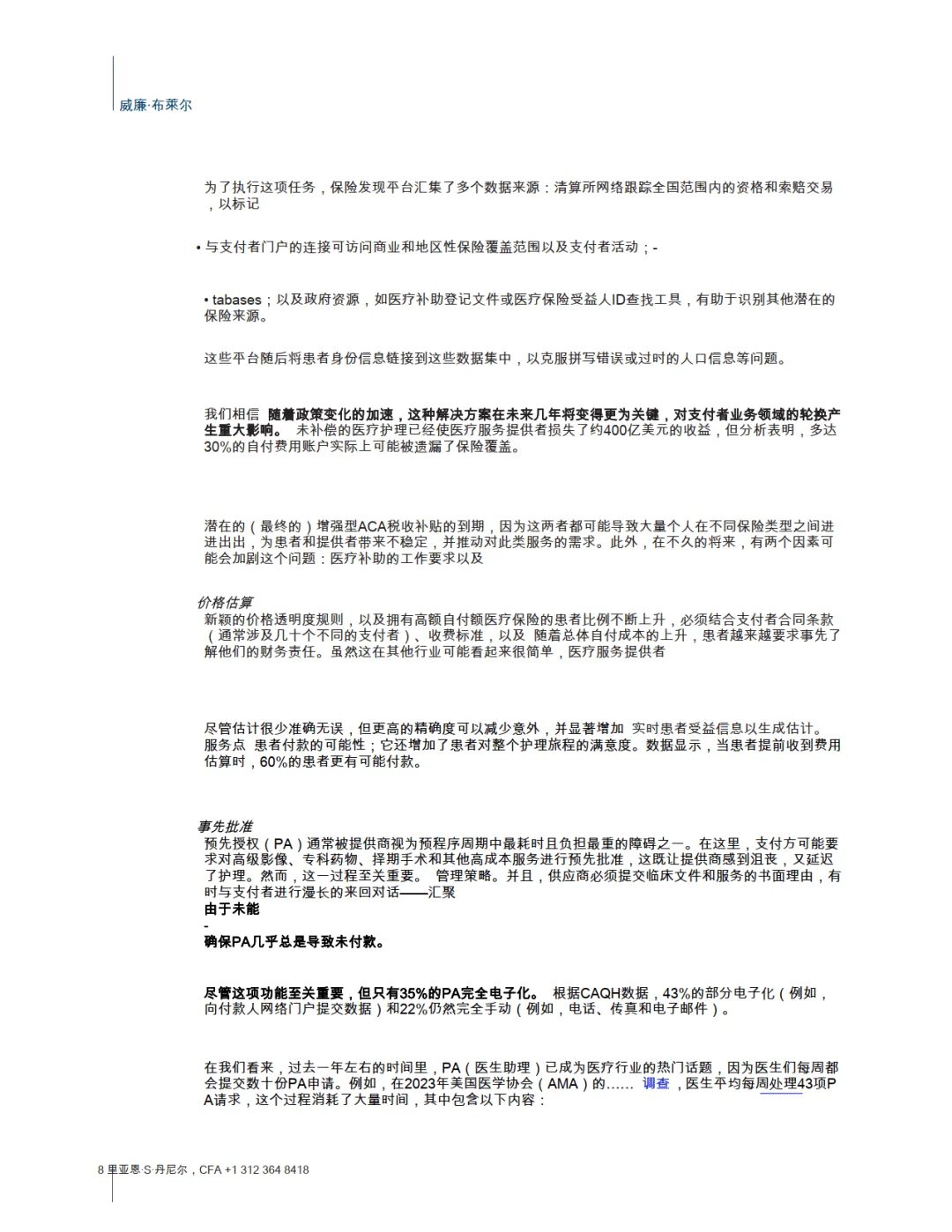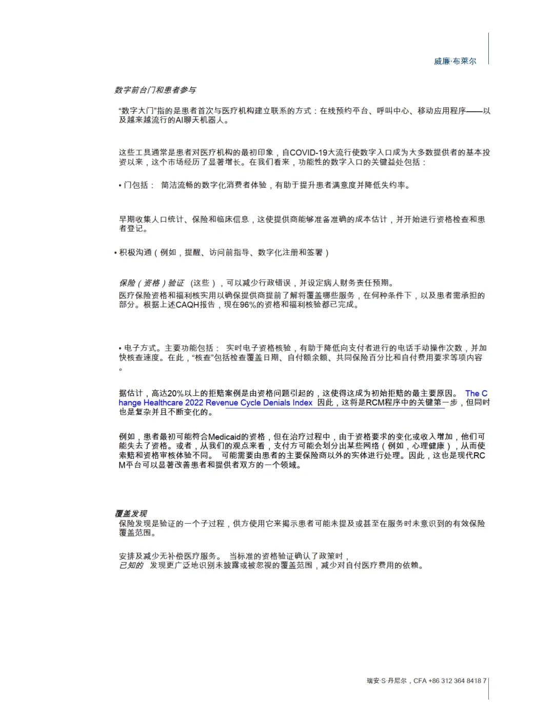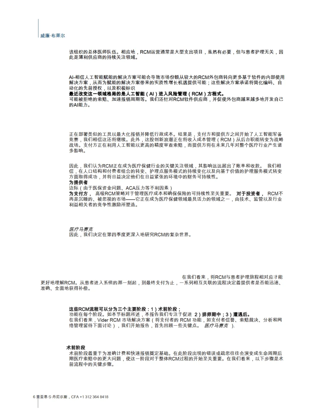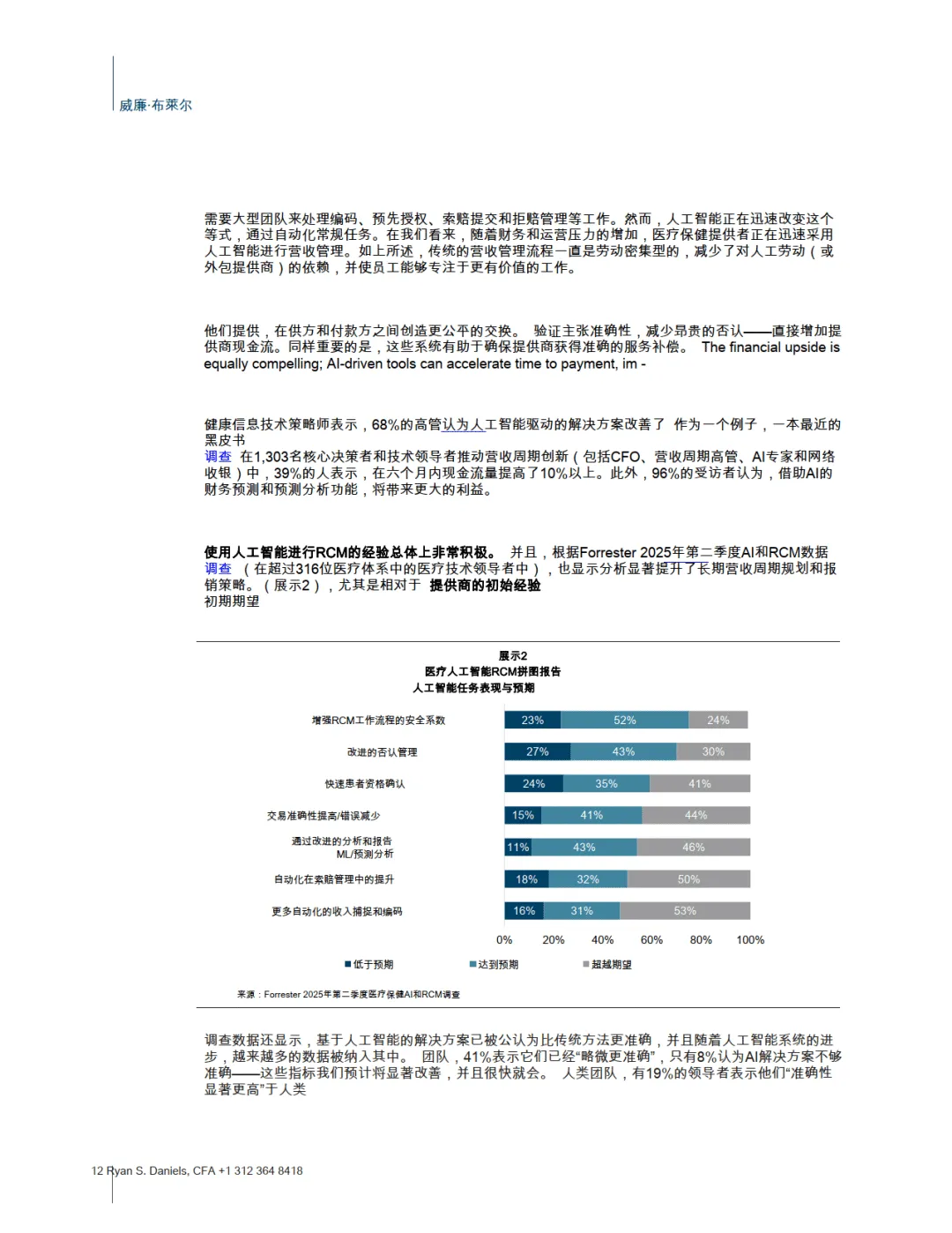 报告将 RCM 流程分为术前、术中、术后三个阶段,AI 在各阶段均实现深度应用:术前通过 AI 聊天机器人、保险资格自动验证、价格精准估算等优化患者体验并减少前期错误;术中依托自然语言处理实现临床文档自动编码、计费捕获优化,提升索赔提交的准确性;术后利用 AI 完成拒赔预测与上诉自动化、汇款流程整合、应收账款智能管理,大幅降低拒付率并加速资金回笼。其中,索赔拒付管理、预先授权自动化、患者财务互动数字化是 AI 应用的核心痛点领域,相关解决方案已实现拒付率显著下降、医护人员行政工作时间大幅减少的实际效果。