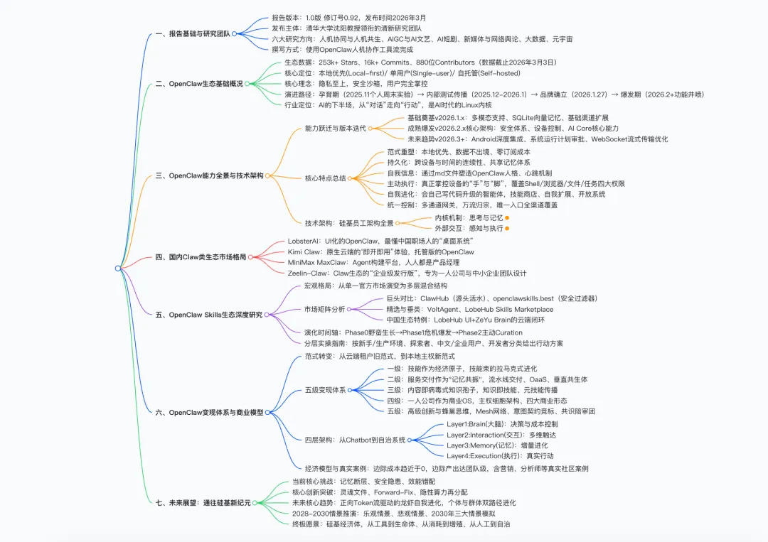 2026年3月,清华大学新闻学院/人工智能学院双聘教授沈阳领衔的清新研究团队发布《OpenClaw发展研究报告》1.0版(修订号0.92),该报告全程使用OpenClaw人机协作工具流完成撰写,是国内首个对OpenClaw开源Al代理生态进行全维度、系统性深度研究的权威行业报告。此报告发布于Al产业迎来范式变革的关键节点,即行业公认的OpenClaw Moment——AI产业正从“对话交互"的1.0时代,全面迈入"主动执行"的AI代理2.0时代。