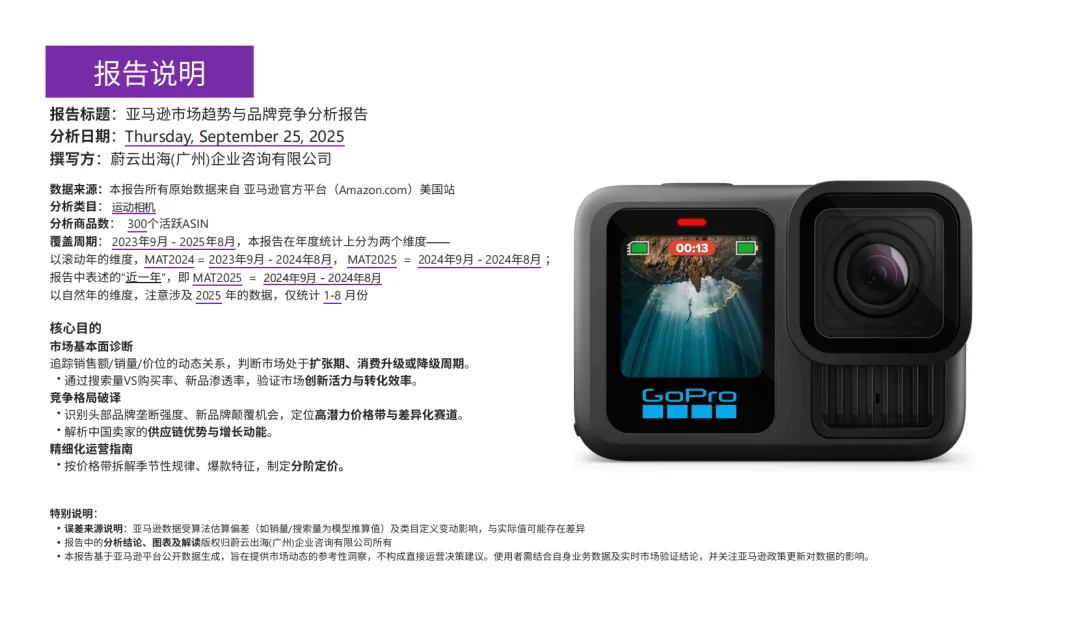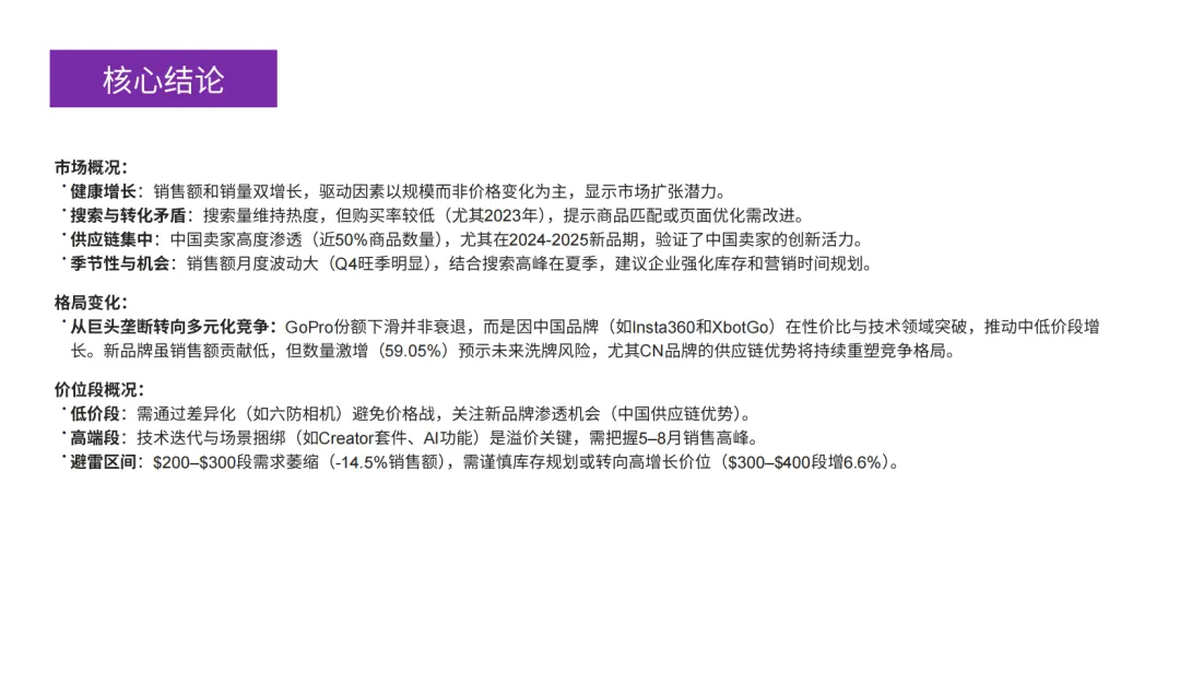 从巨头垄断转向多元化竞争:GoPro份额下滑并非衰退,而是因中国品牌(如Insta360和XbotGo)在性价比与技术领域突破,推动中低价段增长。新品牌虽销售额贡献低,但数量激增(59.05%)预示未来洗牌风险,尤其CN品牌的供应链优势将持续重塑竞争格局