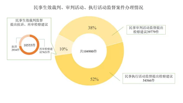 针对民事检察监督案件提出监督意见104900件,同比上升0.9%(2021年至2024年分别为112828件、147049件、143938件、104024件)。其中针对民事生效裁判提出抗诉和再审检察建议共10555件,法院审结9175件,其中改判、发回重审、调解及和解撤诉8324件,占法院审结数的90.7%;针对民事审判、执行活动违法分别提出检察建议39779件、54566件,采纳率为97.4%、96.1%,持续保持较高水平。