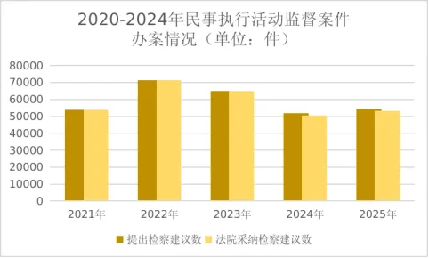 2025年,全国检察机关共受理民事执行活动监督案件67151件,同比上升9.3%。经审查,共提出检察建议54566件,占审结数的82.6%。法院采纳53245件,采纳率96.1%。从所涉违法情形看,民事执行实施行为29429件,占53.9%;民事执行审查行为14505件,占26.6%;民事执行制裁措施10600件,占19.4%。