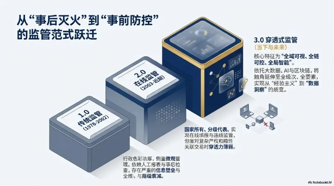 回顾中国国资监管的历史,其演进逻辑紧密围绕着“政企分开、政资分开、所有权与经营权分离”的主线展开。在早期阶段(1978-2002年),监管具有浓厚的行政色彩,侧重于微观管理;2003年国资委成立后,构建了“国家所有、分级代表”的框架,实现了集中统一监管 。然而,随着国企规模的扩张与层级的增多,传统的以报表为核心、以事后检查为主的监管模式逐渐显现出其局限性,特别是在信息壁垒高筑和穿透能力薄弱的问题上,导致监管视野碎片化,难以对复杂产权结构和隐性关联交易实现有效监督 。智能化穿透式监管(智能化监管3.0)的兴起,标志着国资监管迈入了“全域可视、全链可控、全局智能”的新时代 。相较于1.0时期的在线填报和2.0时期的连线监管,3.0时期的核心特征在于利用大数据、人工智能(AI)、区块链等前沿技术,将监管触角延伸至全级次企业、全要素业务。这不仅是技术的升级,更是监管思维的质变:从“事后灭火”转向“事前防控”,从“经验主义”转向“数据洞察” 。1.2 穿透式监管的核心战略价值