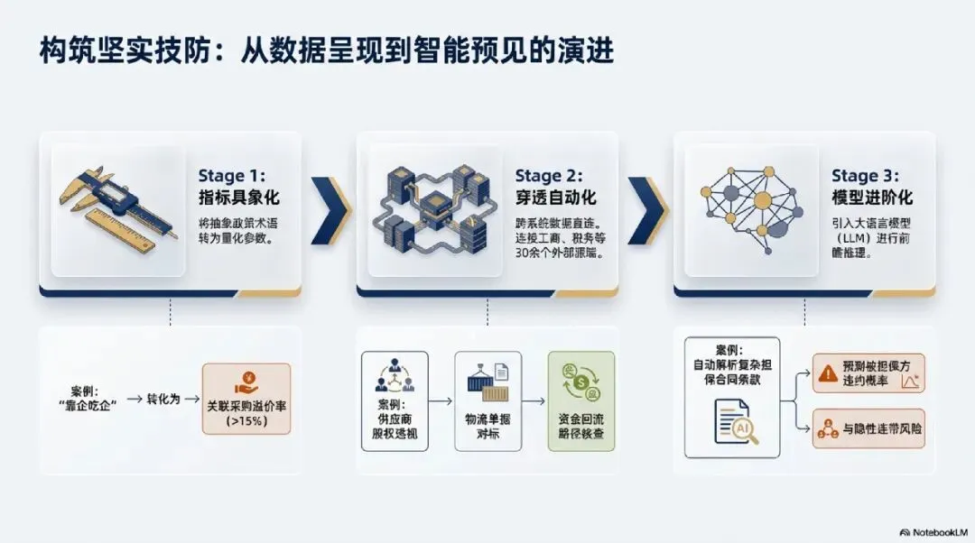 要解决上述问题,系统必须具备从“数据呈现”向“智能预见”转化的能力。某软件企业强调通过三个阶段提升技防水平:首先是指标具象化,将抽象的监管术语转化为可量化的参数(如将“靠企吃企”具象化为关联采购溢价率);其次是穿透自动化,通过连接工商、税务等30余个外部源端,展示从源头到预警的链路;最后是模型进阶化,利用大语言模型(LLM)解析复杂的担保合同条款,预测被担保方的违约概率 。第四章 多维业务主线的全景穿透实践