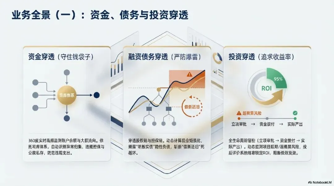 穿透式监管的生命力在于其在各业务主线的深度应用,通过“管资本”的多条主线实现全景透视。4.1 360度资金穿透:守护“钱袋子”