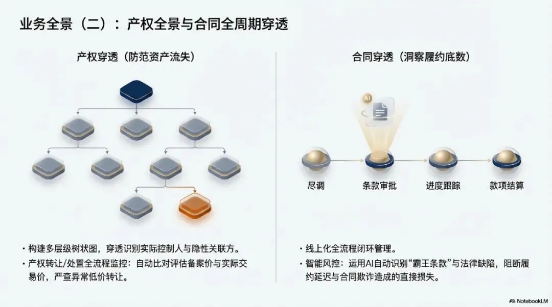 投资穿透侧重于对重大项目的动态监控。系统跟踪项目从立项审批、资金拨付到实际产出的全流程。通过对项目进度与预算执行的实时比对,预警延期或超概算风险;同时,通过投后评价系统监控投资回报率(ROI),防止资源投向低效益或非主业领域 。4.4 产权穿透与资产流失防范