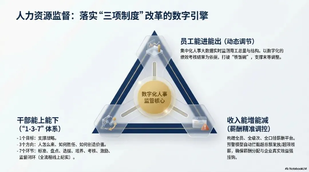某软件企业提出“1-3-7”干部管理体系,旨在打造一支高素质专业化队伍:3个方向:围绕“人怎么来”、“如何胜任”、“如何创造价值”展开。7个环节:形成干部标准、盘点、选拔任用、培养、考核、激励、监督的闭环 。通过数字化全景画像,系统可以立体呈现干部的能力素质。干部任免过程实施线上全流程纪实,确保选人用人的公正性与可追溯性 。5.3 实现“收入能增能减”的薪酬监管